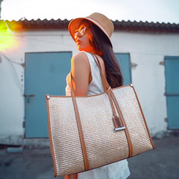 Material: Metallic Coated Raffia / Polished Leather (100% Genuine Leather)